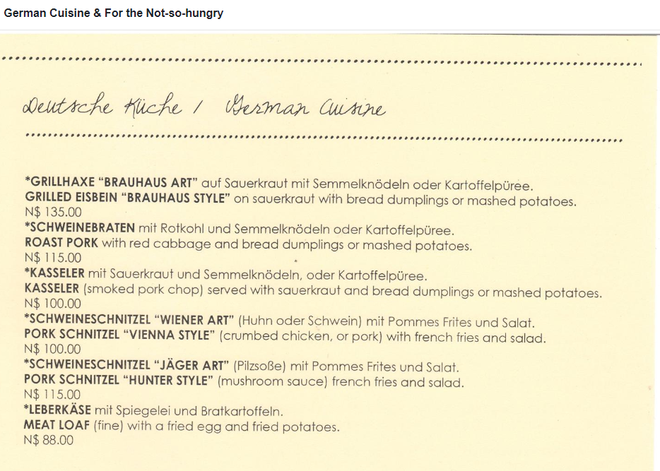 Swakopmund Brauhaus with it's warm, inviting and relaxed atmosphere is your home away from home. Located in the heart of the coastal town of Swakopmund, the Swakopmund Brauhaus offers a menu guaranteed to satisfy even the most delicate of taste buds. Decorated in typical Bavarian style, with memorabilia and flags from all over the world, you might forget, for a moment, that you are located in the middle of one of the world's most renowned deserts, the Namib. But then Swakopmund boasts a rich history of German colonial occupation and the Swakopmund Brauhaus fits the picture. German is widely spoken and many different varieties of German and local beers are tapped as fresh draught beer or sold by the bottle. The atmosphere is festive and friendly with a good mix of locals and tourists from all over the world. You have not experienced Swakopmund's hospitality without having visited the Swakopmund Brauhaus.